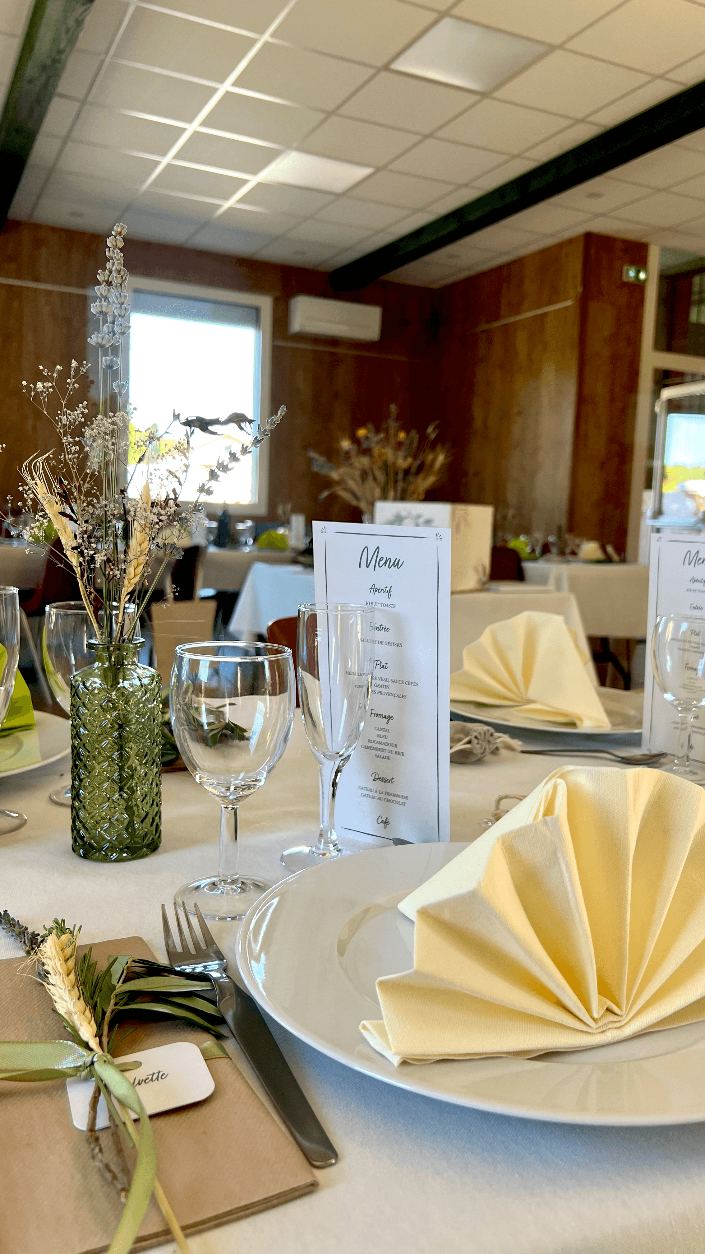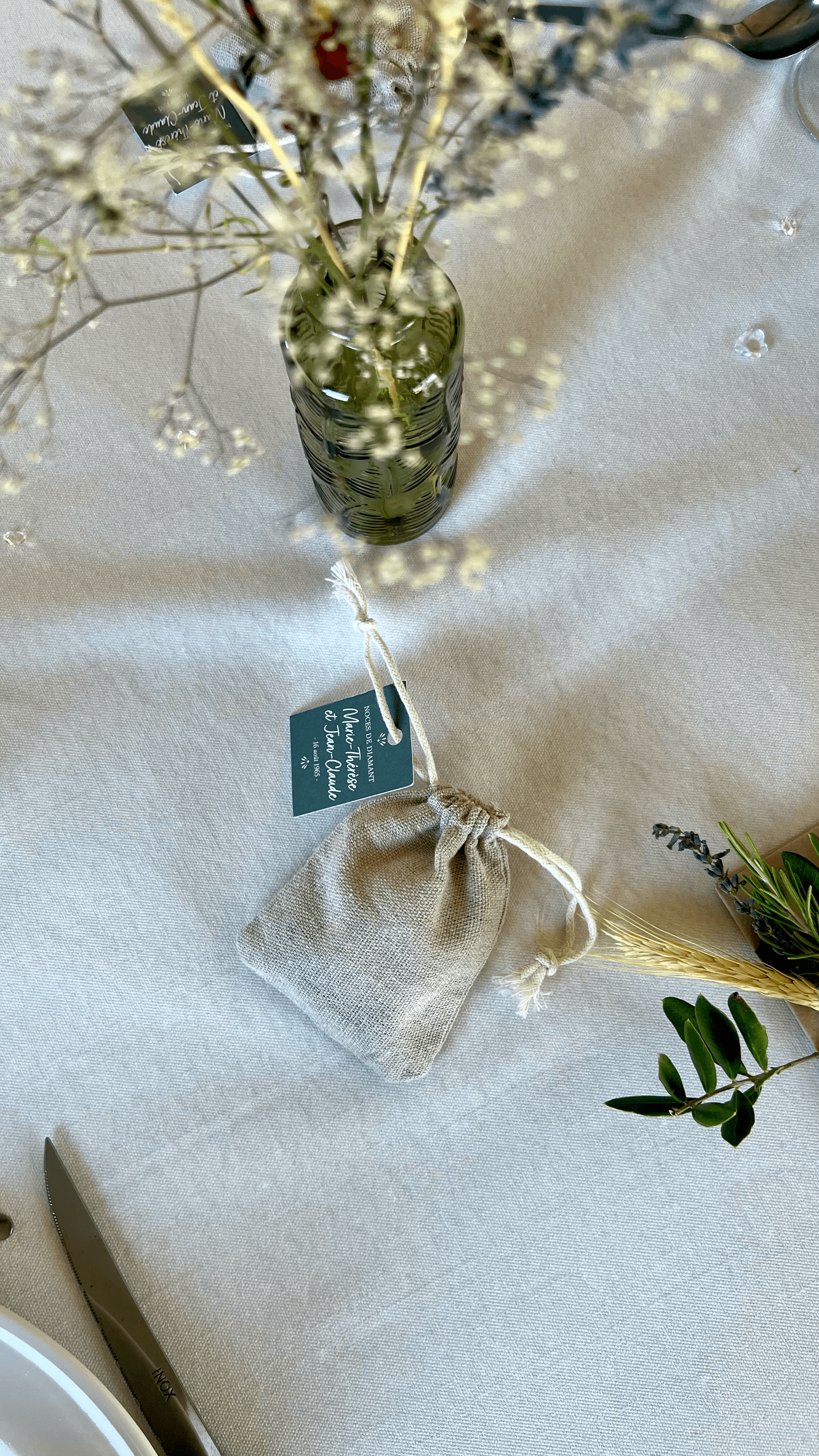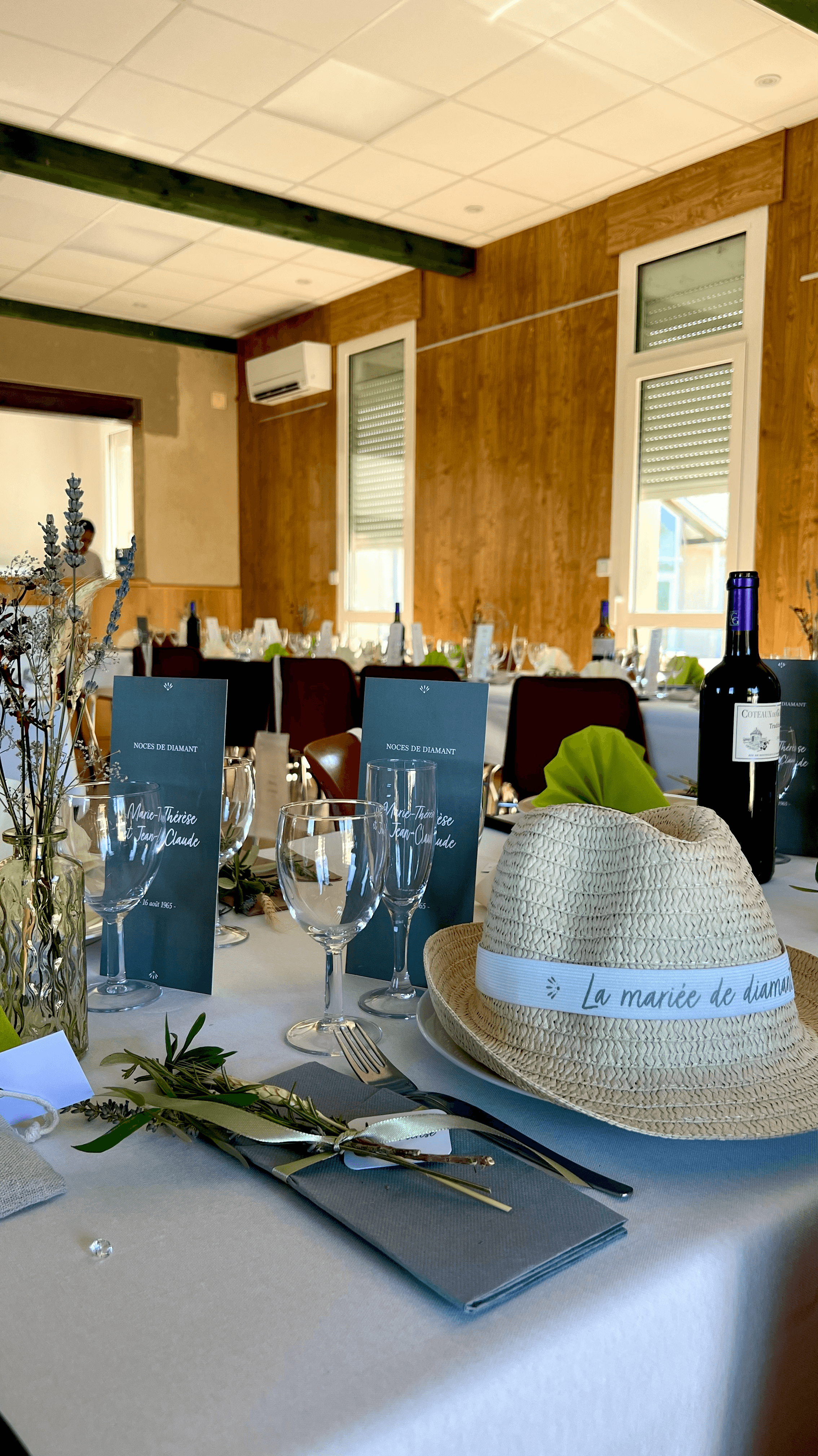 Menus, étiquettes, chapeaux et tote bags ont été pensés pour créer une atmosphère élégante, harmonieuse et remplie d’émotion. Chaque élément reflète la beauté d’une histoire partagée.
