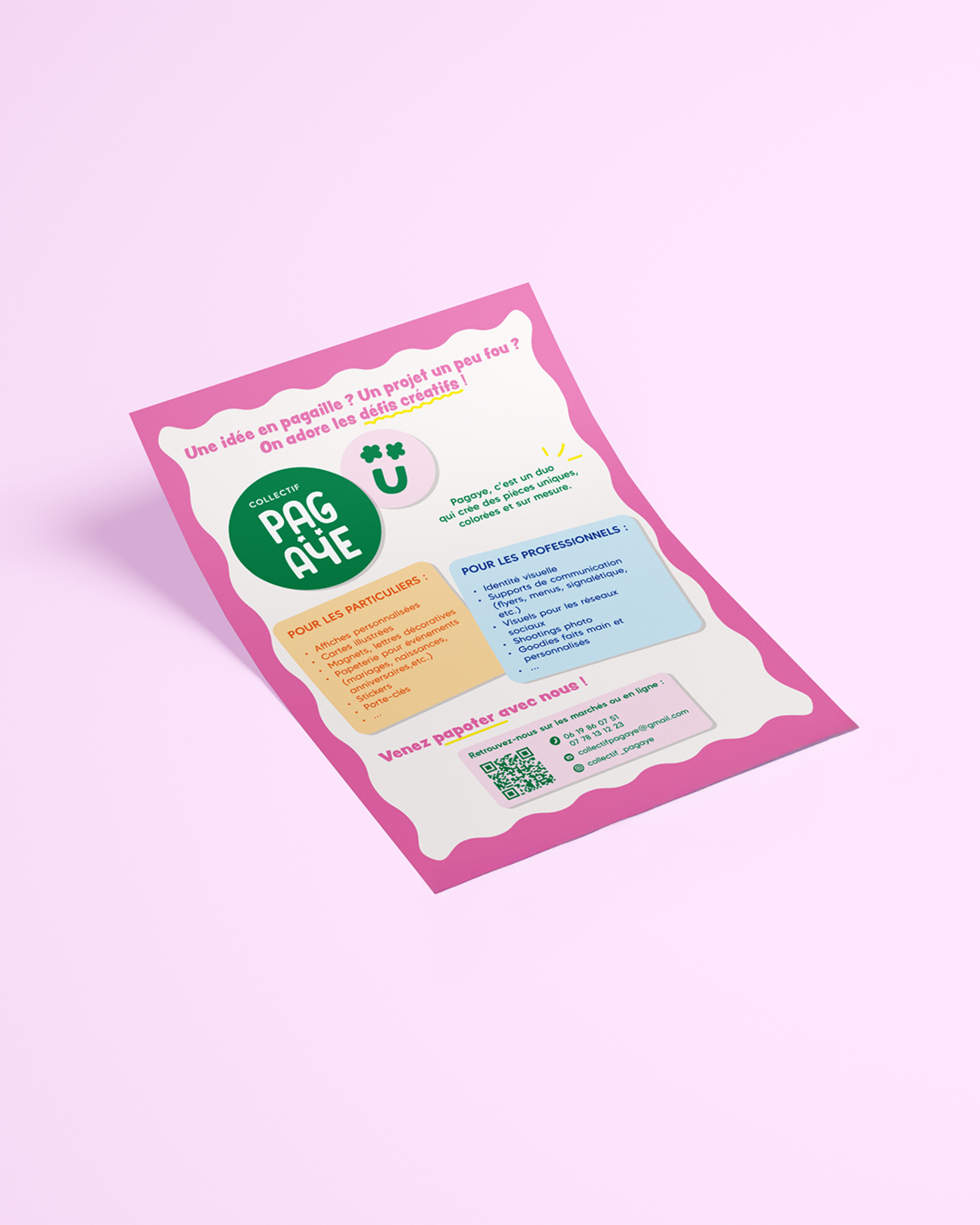 J’ai conçu l’identité visuelle et les supports print du Collectif Pagaye, un univers coloré et artisanal.